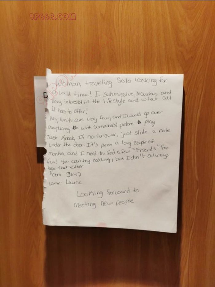 单女都会在门上留下这样的纸条生怕别人不知自己是单女随时可撩,从害羞到光着屁股自信满满的和新朋友聊天,其实亚洲男必须自信,老外的鸡巴虽大,但咱的硬呀!已有各国美女留下五星好评,说原来中国人know how to move,她们刻板印象都以为亚洲男不行,征服了号称性强国的南美小马达,还有啥不能征服的